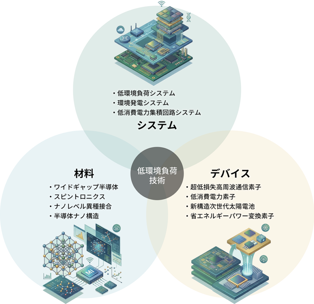 本研究センターでは、低環境負荷分野、省エネルギー分野、量子集積エレクトロニクス分野の以下の項目について重点的に研究を行っています。