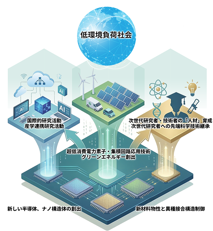 この設置理念に基づき、新しい半導体ナノ構造体の創出と新材料の物性・構造制御に関する学理を追求し、そのグリーンエネルギー創出および超低消費電力素子・集積回路への応用研究を行うことを目的とします。また、これらの主要研究項目に関する国際的研究活動を推進するとともに,次世代研究者への科学技術の継承に寄与します。