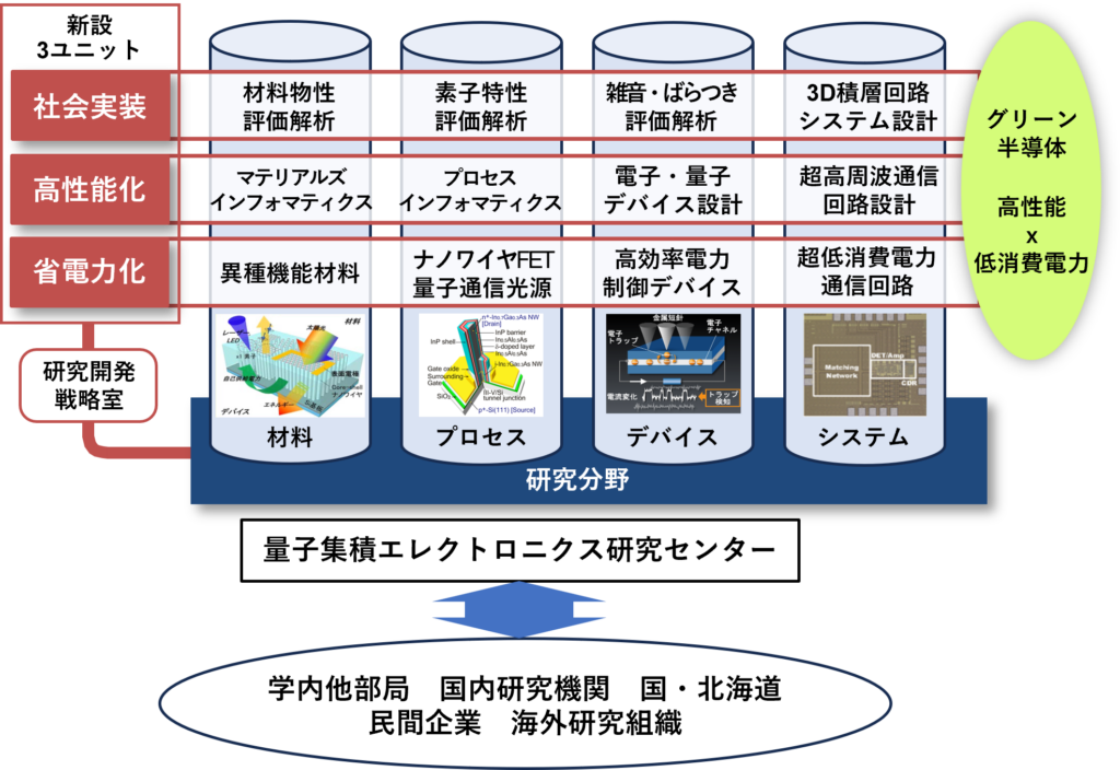 既存の4つの研究分野で展開してきた半導体の材料・プロセス・デバイス・システムに関する研究を要素技術として縦串とした上で、それらを横串を通すような形で結びつける、半導体の社会実装、高性能化、省電力化にかかわる研究を推進する3つの研究ユニットを2024年度に新設しました。
